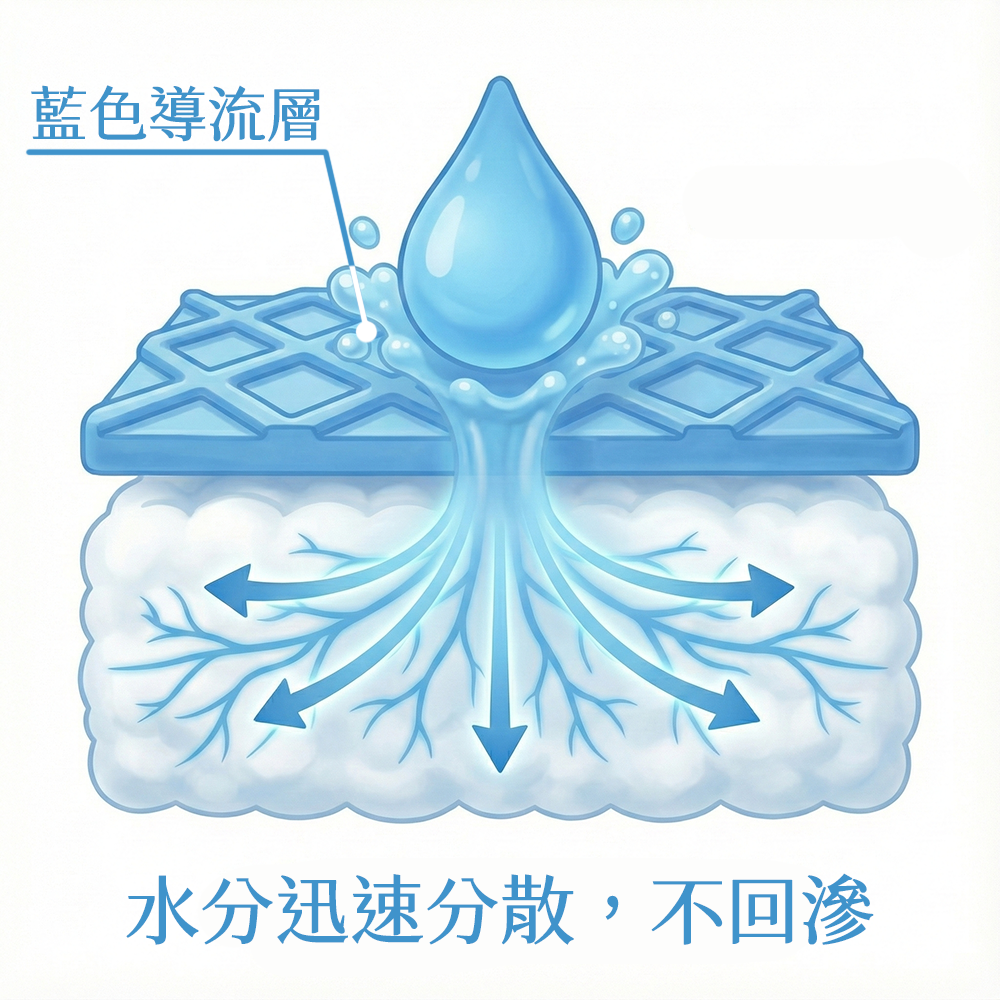 ● 不回滲: 特殊導流網層設計,瞬間將水分吸入底層,表層維持乾爽,並且達到重壓也不回滲的效果,讓長輩遠離紅屁屁困擾。