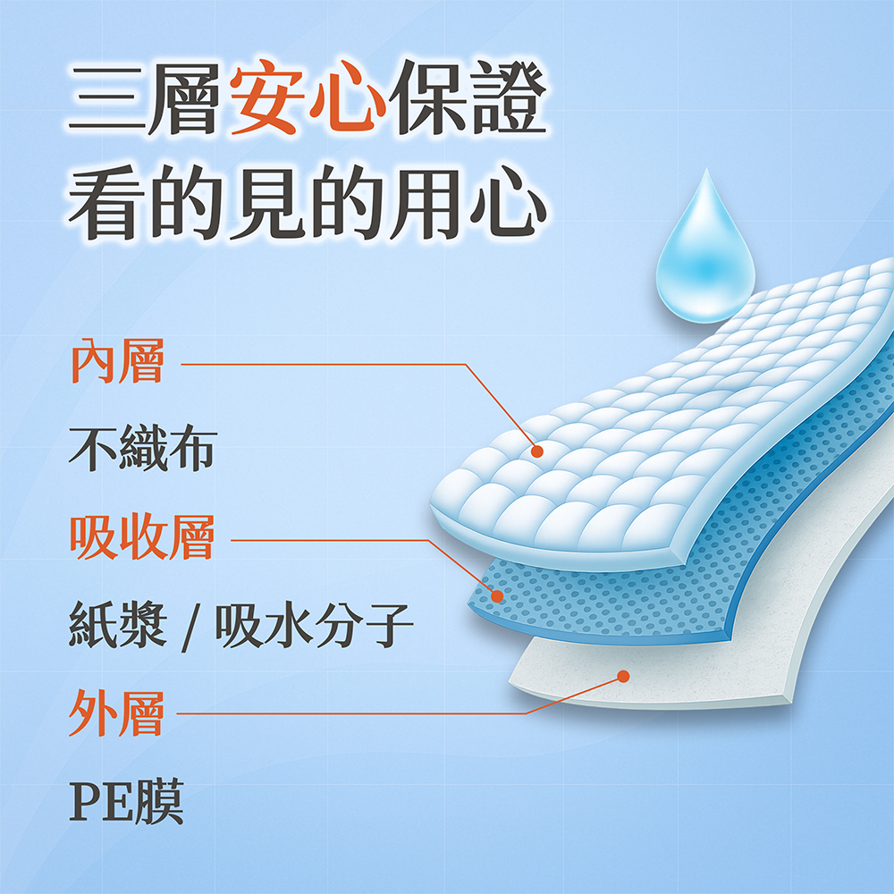 • 吸收層:鎖水高分子 / 紙漿
